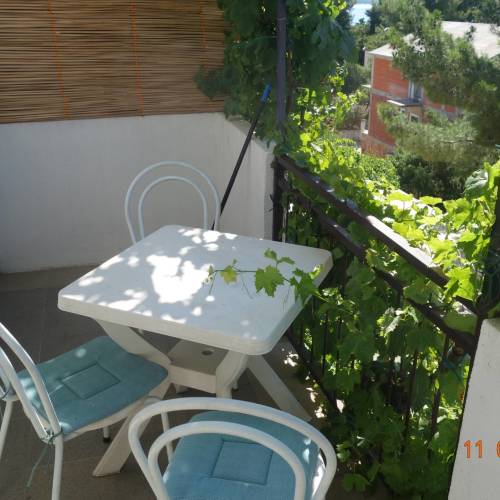 Iz apartmana se izlazi na juzni balkon 8m2 sa stolom i stolicama. Sa balkona se uz ugodnu hladovinu od vinove loze, pruza odlican pogled na more.