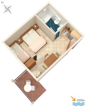 Dvokrevetni studio apartman A6 ima poseban ulaz. Dnevni boravak sa dva lezaja, kombiniran je sa kuhinjom i trpezarijom u istoj prostoriji.